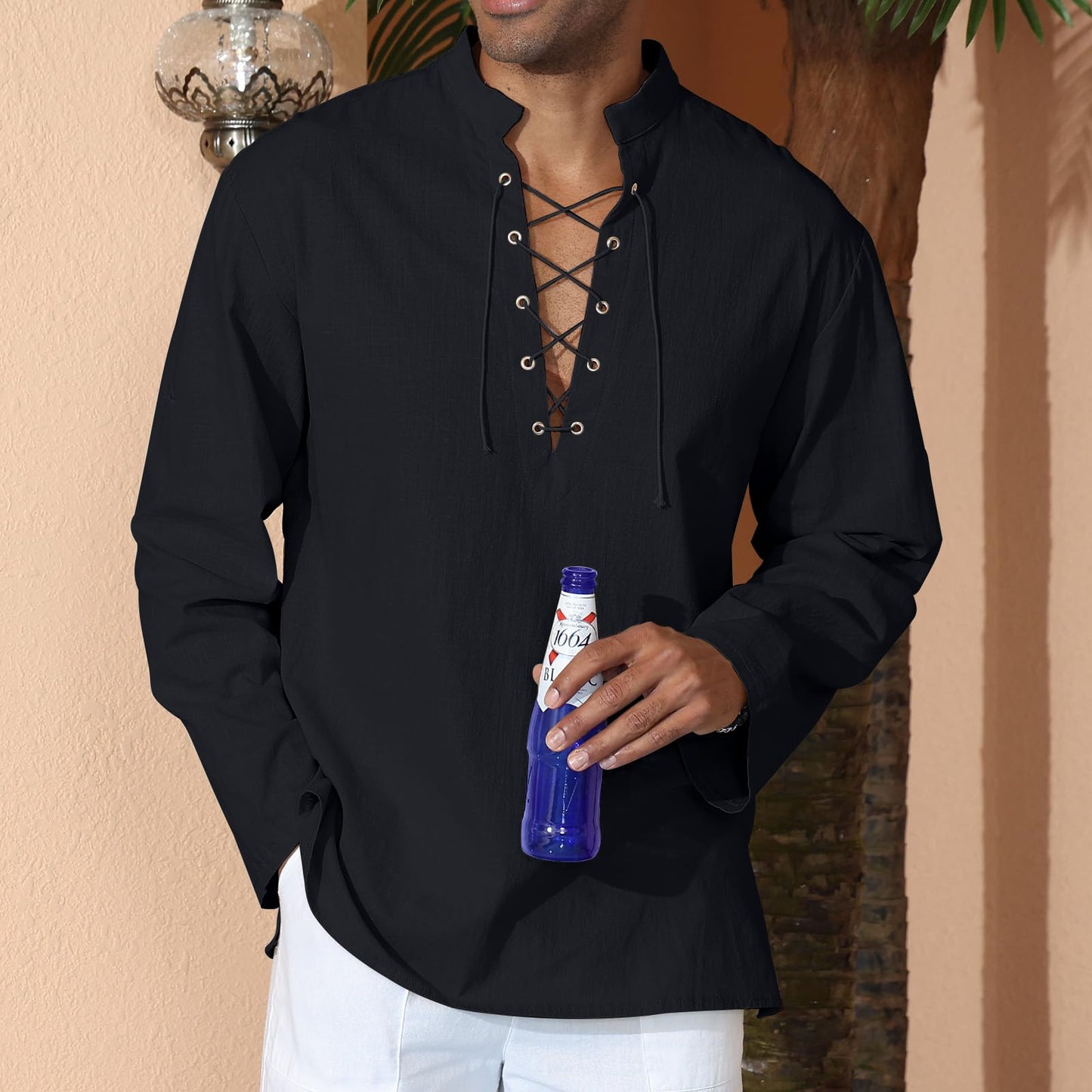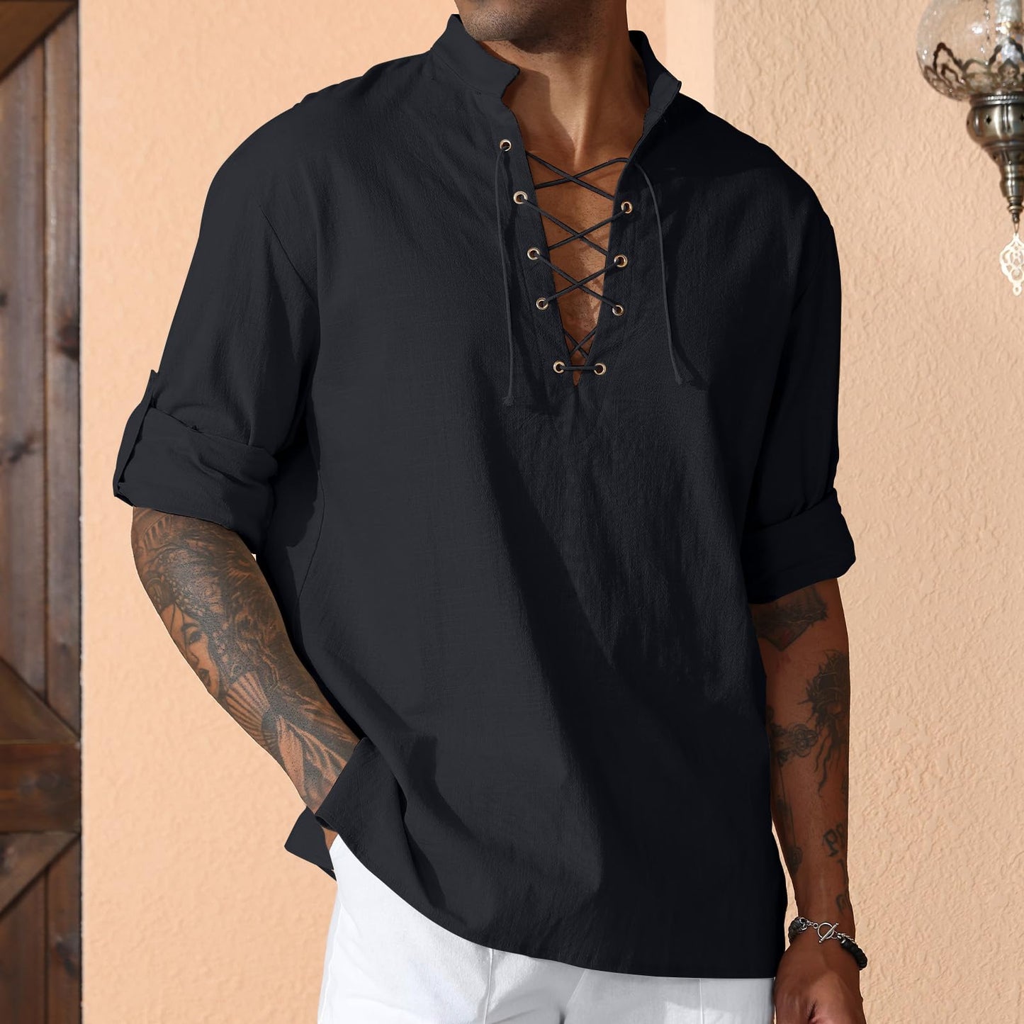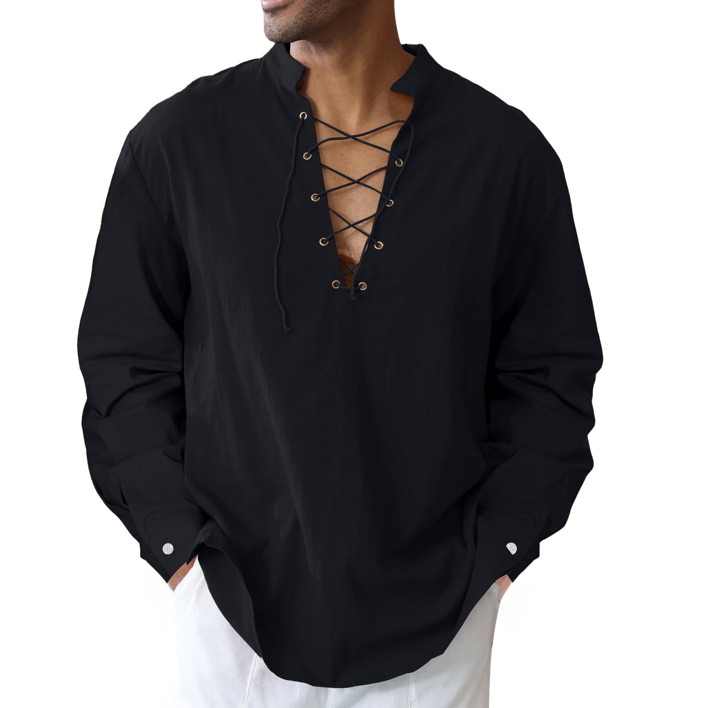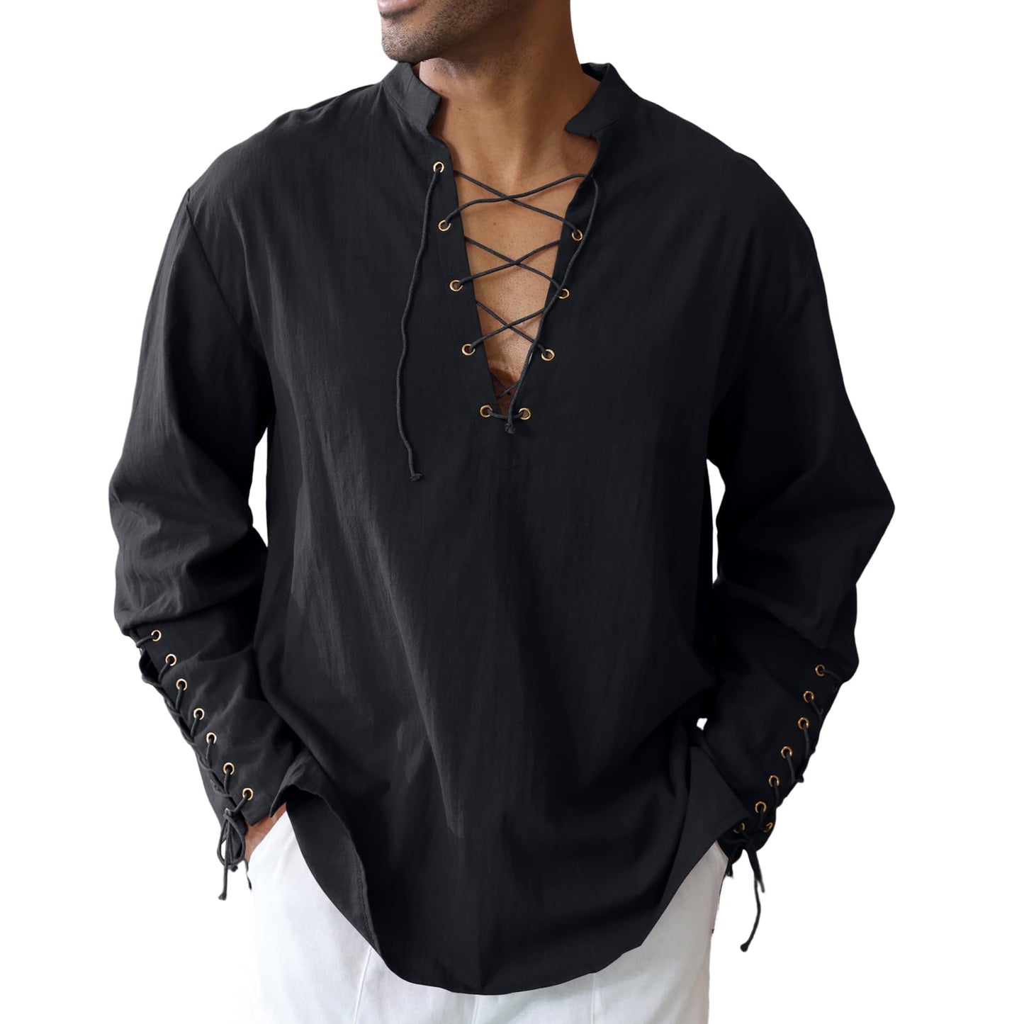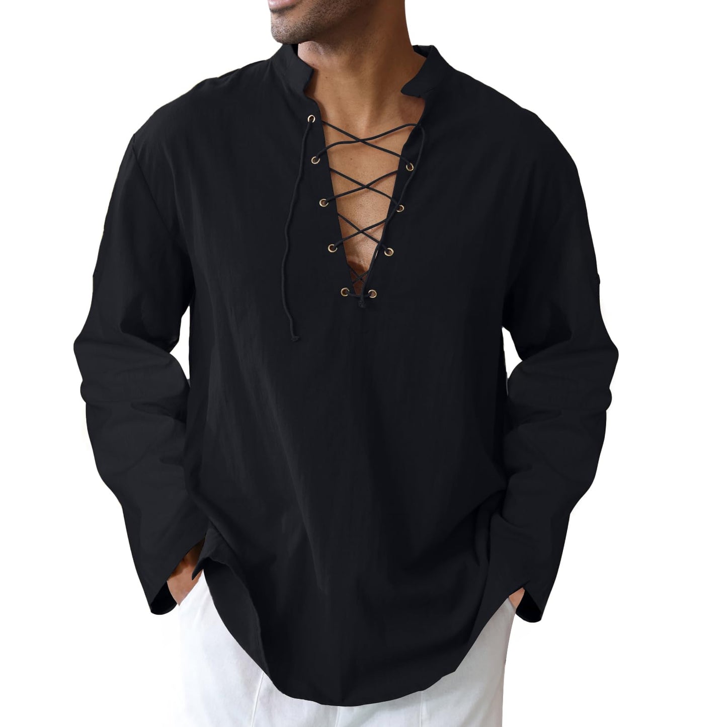 Men's Cotton Linen Shirt Drawstring Arm Banded Tops Medieval Viking Pirate Renaissance Halloween Costume 1X Black