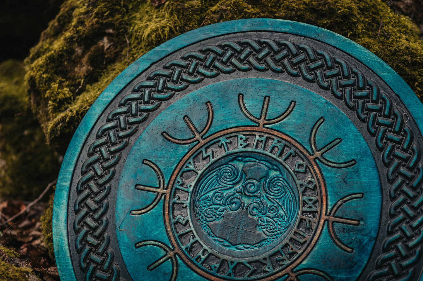 Viking shield with carved Odin's Raven symbols Huginn and Muninn
