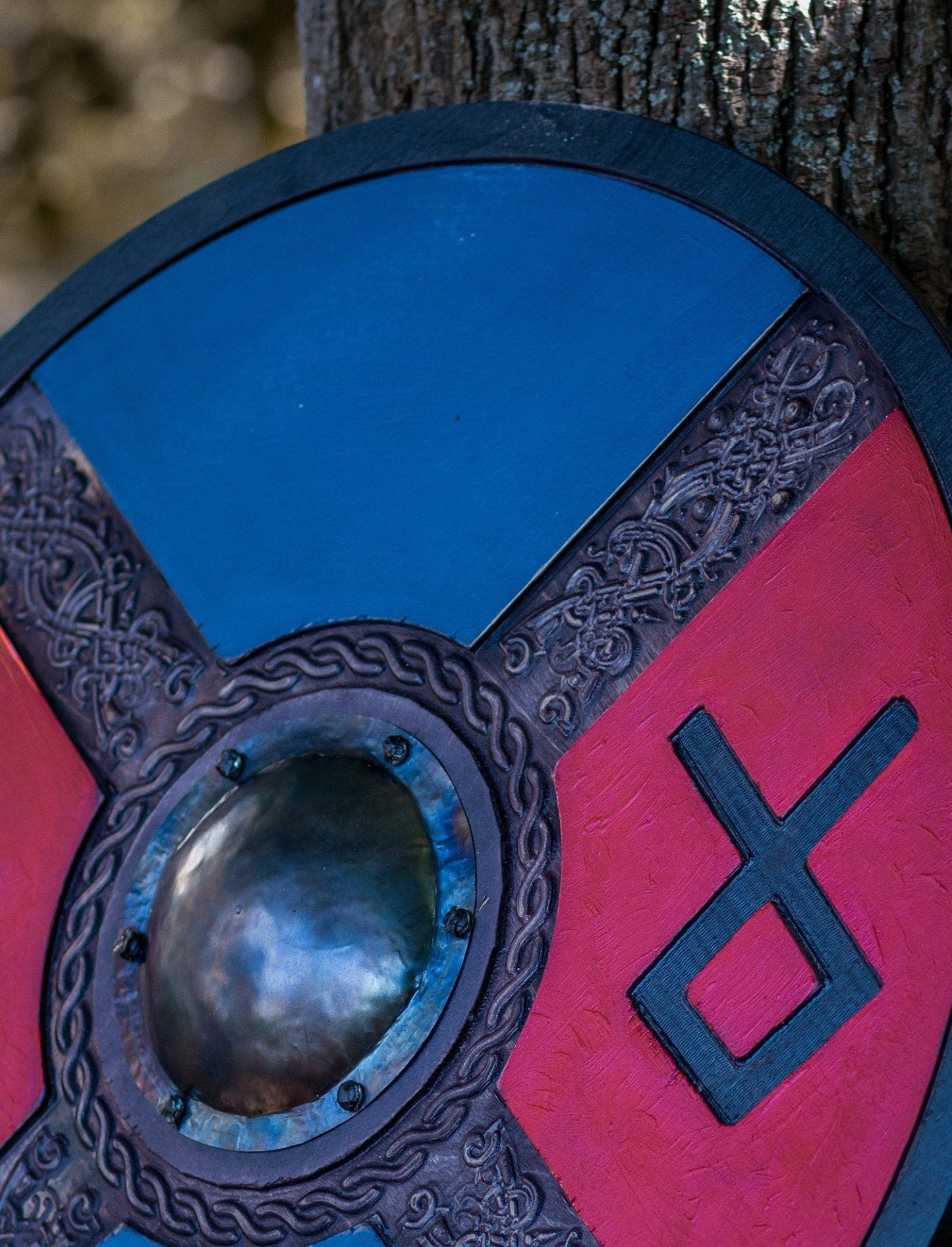 Handcarved Blue And Red Style Rune Viking shield, 24"